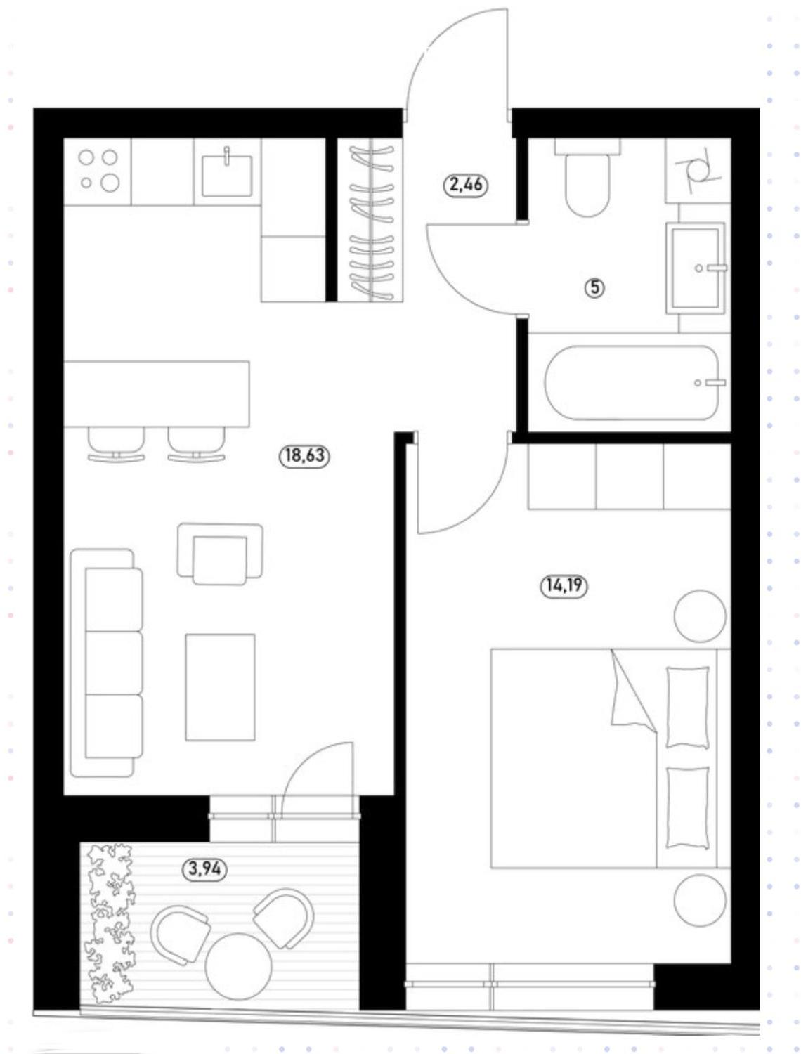До вашої уваги пропонуємо 1-кімнатну квартиру площею 41,50 м.кв. на 2-му поверсі: