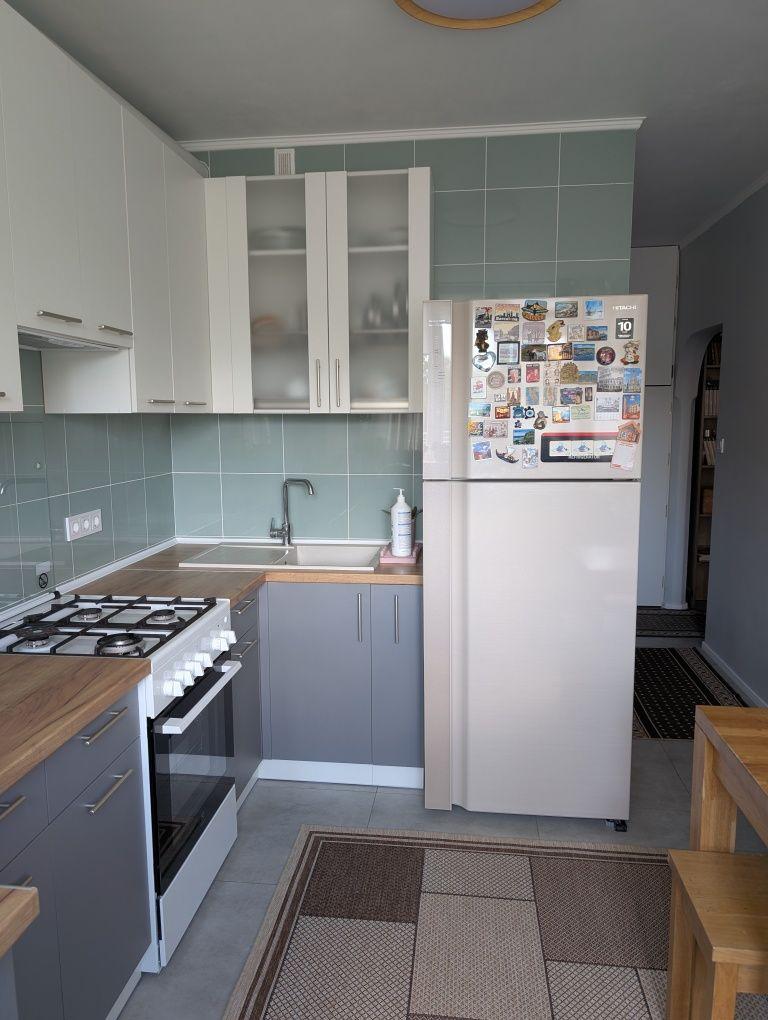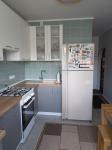 Меблі та техніка: холодильник, плита, пральна машина, меблі на кухні.